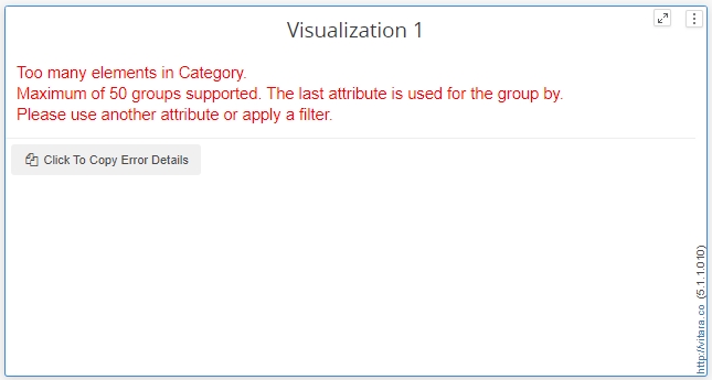 If we draw the chart’s series using an attribute, for example, an attribute in ‘Color by’ or ‘Break by’ drop zones, Vitara charts will draw the series if the elements in the attribute are less than 50. If the elements of the attribute in the ‘Color by’ or ‘Break by’ drop zones are more than 50, then Visualization will display a warning message “Too many elements”.
