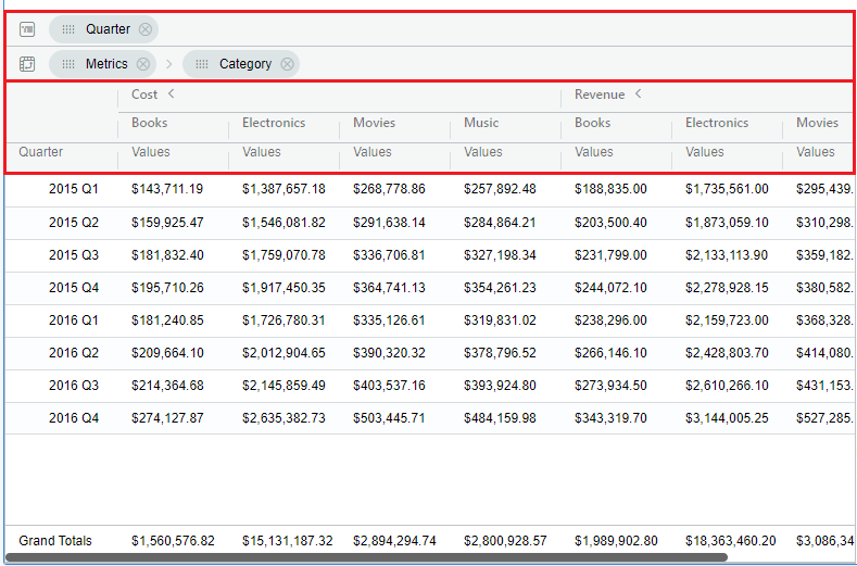 Below is the screenshot where the Category, Quarter are the two attributes and Cost, Revenue are the two metrics added to the chart. The ‘Mover to rows’ is applied on a metric in the chart and the ‘Metrics’ column is pivoted along with the ‘Category’ attribute.