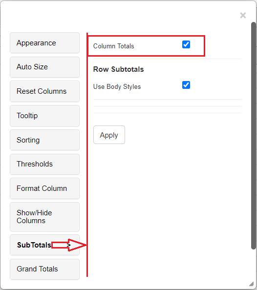 Starting from version 5.2.8, the Column Totals option will only be used to display total columns in non-pivoted charts. When using a pivot, this option will be hidden. In version 5.2.8, two new options have been added to the Subtotal tab: Pivot Row Total and Pivot Group Total.[Click here to learn more.](https://docs.vitaracharts.com/grid-microchart-guide/subtotals#enhancements-in-version-528-pivot-row-total-and-pivot-group-total)