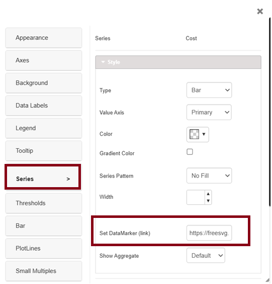 From Version 5.1.1, we have added a new feature that allows us to add markers to bar and column charts using image addresses (links). This functionality can be enabled under the series tab with name ‘Set DataMarker (link),’ where we must enter the URL and press the Apply button.