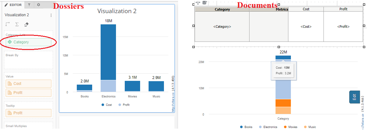 In documents we can give any number of attributes but in dossiers we can give only two attributes; one attribute in ‘Category Axis’ drop zone and in one ‘Vertical Axis’.