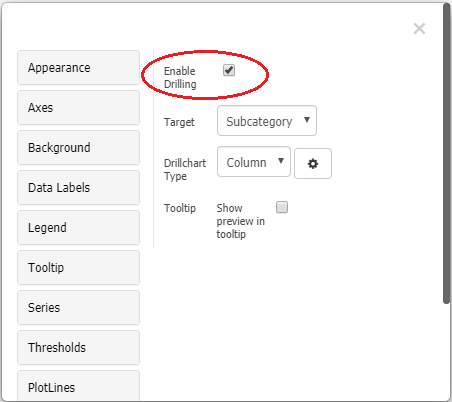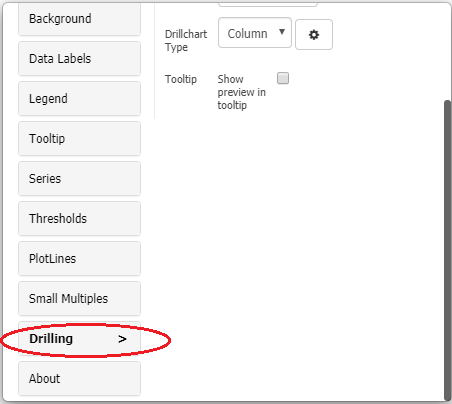 **Dossiers:** In dossiers, drag and drop an attribute into the ‘Drill Target’ drop zone to enable the chart’s drilling capability. When we place an attribute in the ‘Drill Target’ drop zone, the vitara property editor will display the drilling tab.