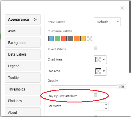 In Documents the properties **Color By Last Attribute** and **Play By First Attribute** can be enable/disabled using the property editor window. Hover the cursor over any vitara chart to get ‘Edit’ button. Click on the ‘Edit’ button to open vitara property editor window.