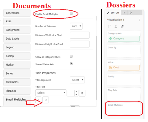 In Dossiers just drop an attribute in Small Multiples drop zone to enable Small Multiples feature. In documents Small Multiples feature can be enabled using property editor window.