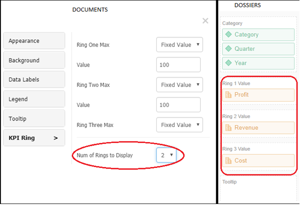 It is simple to categorise metrics in Dossiers as Ring 1 Value, Ring 2 Value, and Ring 3 Value. We have a property editor option in Documents to show the number of rings to display in the chart. You can see a clear example in the screenshot below.