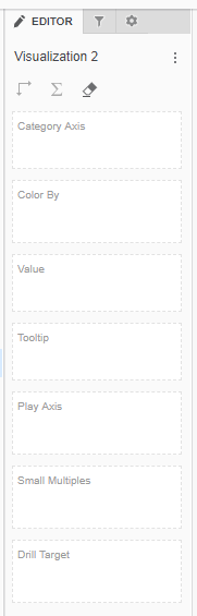 When we apply a Vitara chart to a visualization in dossiers, the editor panel is updated to reflect the chart. The standard editing panel will appear as shown in the screenshot below. In the editor panel, new drop zones such as Category Axis, Color by, Value, Tooltip, Play axis, Small multiple, and drilling will be visible.