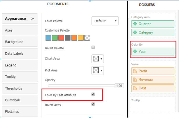 Colour by and Small Multiples options are available on the Vitara Dumbbell chart. You can easily drop down from the data set in the Colour By Drop Zones in Dossiers. Colour By Last Attribute and Small Multiples must be enabled in the Documents property editor.