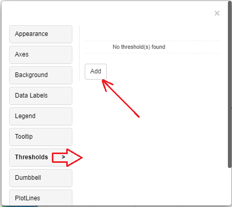 To apply thresholds in vitara charts, hover the cursor on the chart. Vitara chart will display an ‘Edit’ button. When you click on this ‘Edit’ button the properties window will pop out. Select the thresholds tab to open threshold editor. In the window you can add a new threshold or delete any existing threshold or modify the existing threshold.