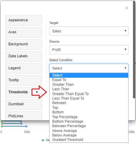 In the business point of view, certain part of the chart needs to be highlighted to draw more attention from the desicion makers. For example, highlight the stores where total sales is greater than a specific value or highlight the top 10 products whose sales is high during last year’s winter. Thresholds are very useful objects in these use cases.
