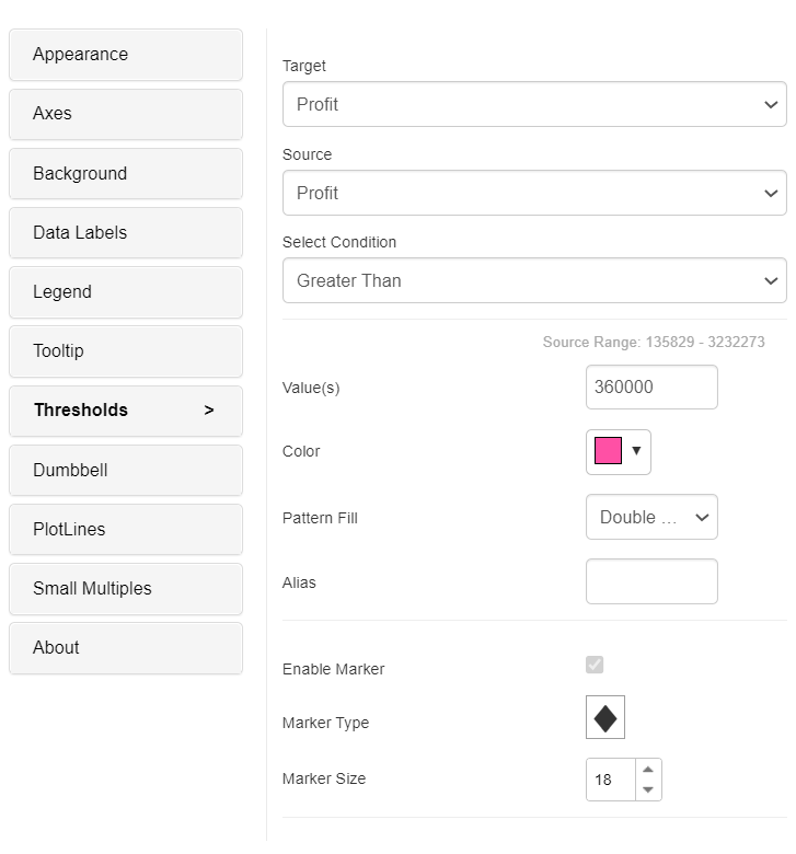 From version 4.9.0, we can use pattern fill in thresholds (Grid/Square/Double Square/Slash), certain part of the chart can be filled with a pattern.