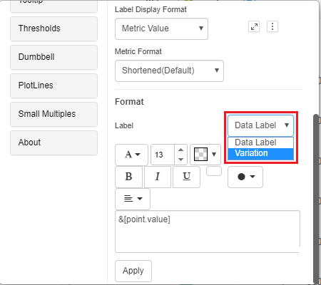 We can modify the data labels format for the data labels and variation also. You can see the attached screenshots below.&#x20;
