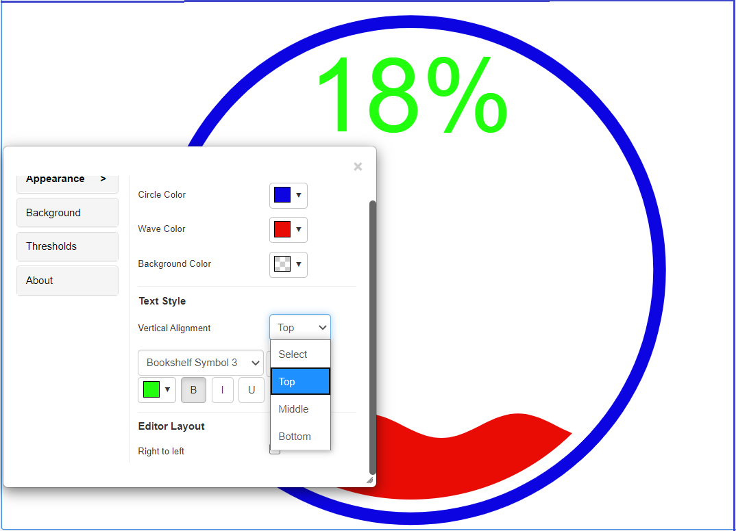 Based on the ratio of the two metrics we can apply thresholds on ring, wave or on the background of the chart. Hover the cursor on the chart, Click on the ‘Edit’ button and select the ‘Thresholds’ option in the properties window.