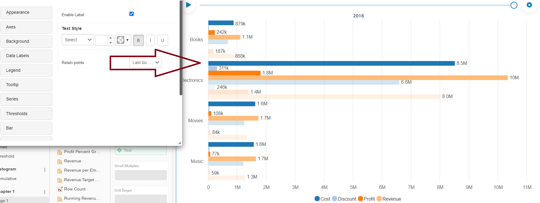 From the 4.9.3 version, Retain point (First,Last but one) feature now moved under Play Axis tab which can be accessed from property editor window. When we select the ‘First’ option under retain point, the first elements are displayed in comparison to the final elements.\