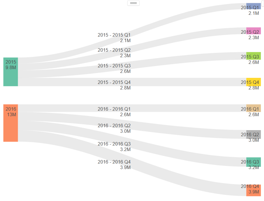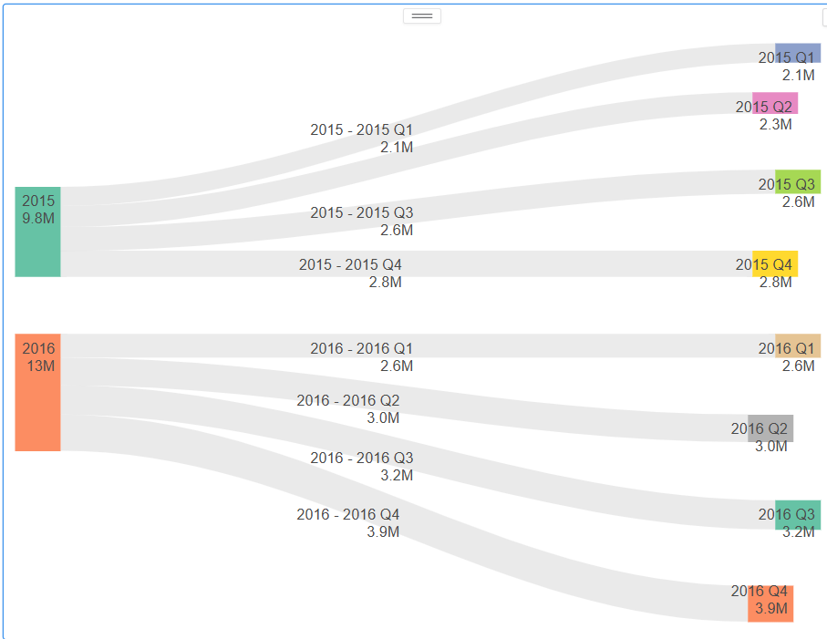 There are three attributes in the screenshot below: year, category, and subcategory. The vitara sankey chart will create nodes for each of these attribute items in normal mode.The links will go from Year to Category, and then from Category to Subcategory.