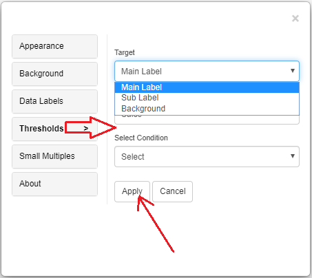 Open the property editor by clicking on the ‘Edit’ button and select the ‘Threshold’ tab. In the threshold, the editor window applies source, target, threshold condition, and other related information. In the below screenshot, for Simple KPI charts panel colors and icons are set using thresholds.