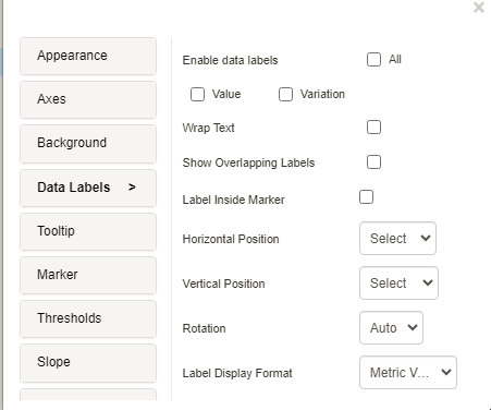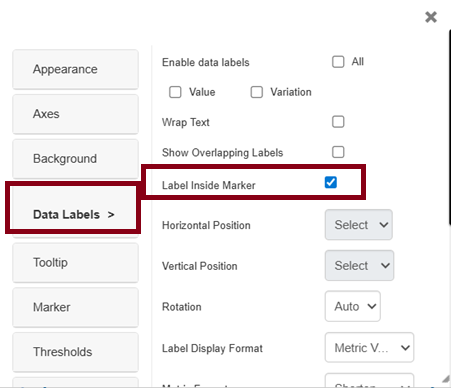 We can now display data labels inside the marker starting with version 5.2. A slope chart’s readability and clarity can be improved by adding labels inside the markers by directly connecting the values to the corresponding data points. Viewers can more easily recognize and relate data points to their relevant categories by using labels inside markers. This is particularly helpful in slope charts, where the comparison of changes between two points for various categories is the main focus. This functionality can be enabled by going to the editor’s data labels property and checking the “Label inside the marker” check box.