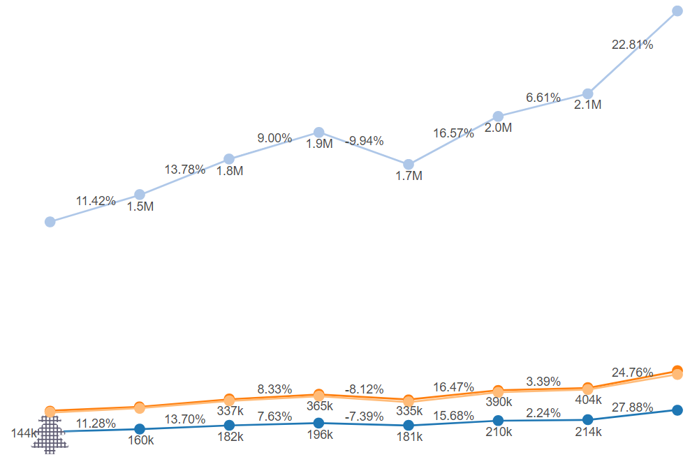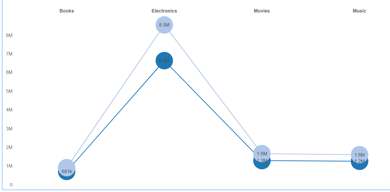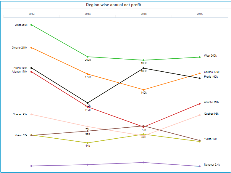 The slope graph depicts the change in metric value for a particular attribute value over time. As a result, each (sloping) line is represented by two points, one at the beginning and one at the end of time. When more than two time values are specified, all points are plotted in a line chart fashion. Along the slope-line connecting the points, a label displaying the percentage variation between two successive points is presented (optional).