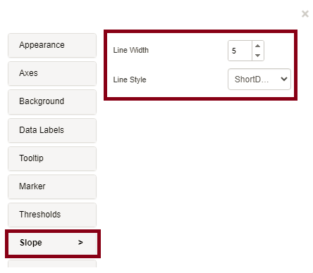 With version 5.2, a new tab called ‘Slope’ was added, allowing us to customize the line style and line width. Line width can be used to highlight a trend or change in value for specific categories. If certain categories are more significant or demand extra attention, using a different line width for those categories can make them stand out. Different line types, such as solid, dashed, or dotted lines, can be used to differentiate between the slope chart’s many categories. This is particularly effective when numerous lines connect various categories, making it easier for viewers to distinguish between them. When comparing two conditions, time periods, or groups, utilizing various line styles for each set of data can help highlight the differences.
