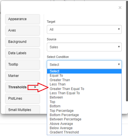 In the business point of view, certain part of the chart needs to be highlighted to draw more attention from the desicion makers. For example, highlight the stores where total sales is greater than a specific value or highlight the top 10 products whose sales is high during last year’s winter. Thresholds are very useful objects in these use cases.