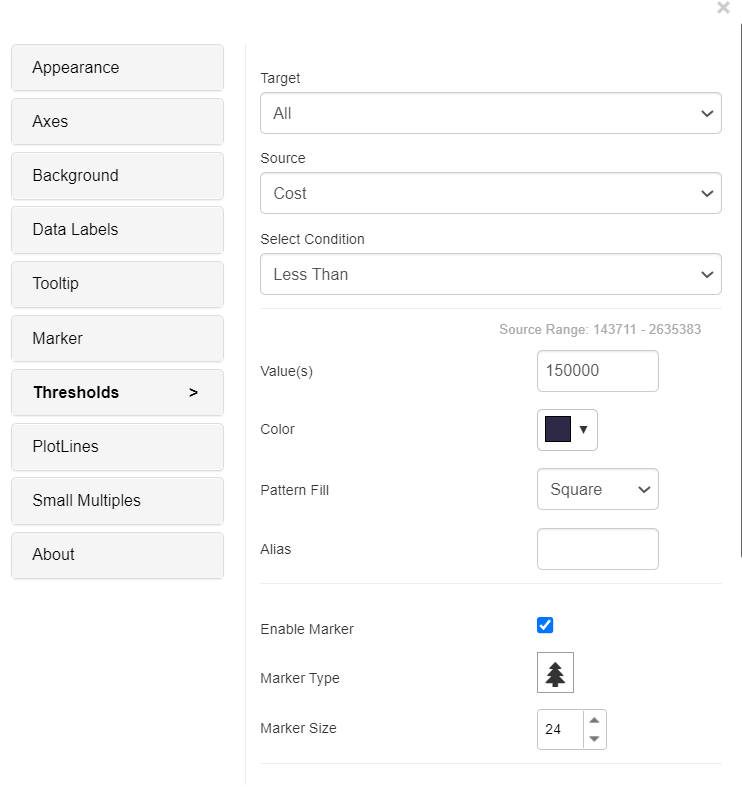 From version 4.9.0, we can use pattern fill in thresholds (Grid/Square/Double Square/Slash), certain part of the chart can be filled with a pattern.