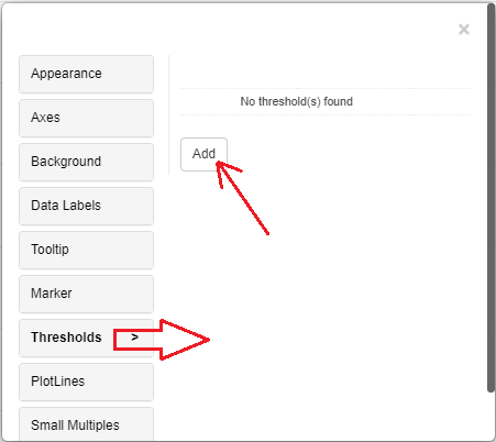 To apply thresholds in vitara charts, hover the cursor on the chart. Vitara chart will display an ‘Edit’ button. When you click on this ‘Edit’ button the properties window will pop out. Select the thresholds tab to open threshold editor. In the window you can add a new threshold or delete any existing threshold or modify the existing threshold.