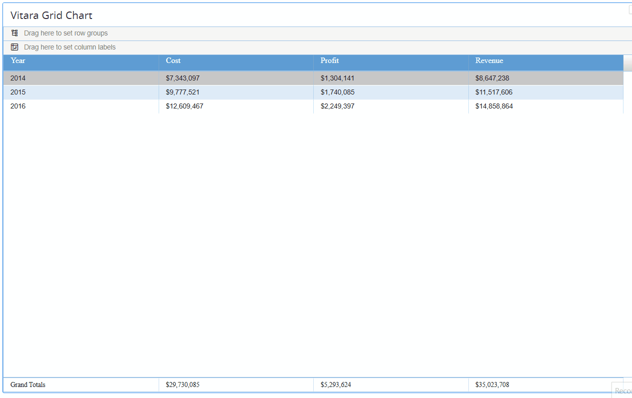 * When a user clicks on the Year "2014" in the Grid chart, they will be redirected to the Target dashboard showing quarterly data for that year.<br>
