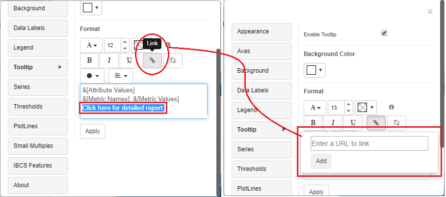 Select the tooltip text for which the link needs to be included in the tooltip editor box. Alternatively, manually insert text in the tooltip window (for example, ‘click here for detailed report’), select the text, and click on the link icon, as seen in the screenshot below. After that, a new ‘Enter a URL to link’ window will appear.&#x20;