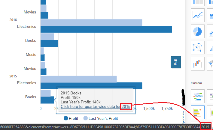 When you hover over the tooltip link for a specific Year (e.g., 2015), the Year value in the URL API is automatically updated to reflect the selected Year. This ensures that the correct filter value is dynamically passed to the Target dashboard.