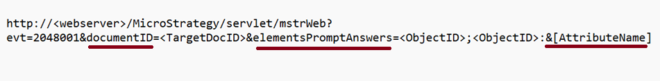 http\://\<webserver>/MicroStrategy/servlet/mstrWeb?evt=2048001\&documentID=\<TargetDocID>\&elementsPromptAnswers=\<ObjectID>;\<ObjectID>:&\[AttributeName]